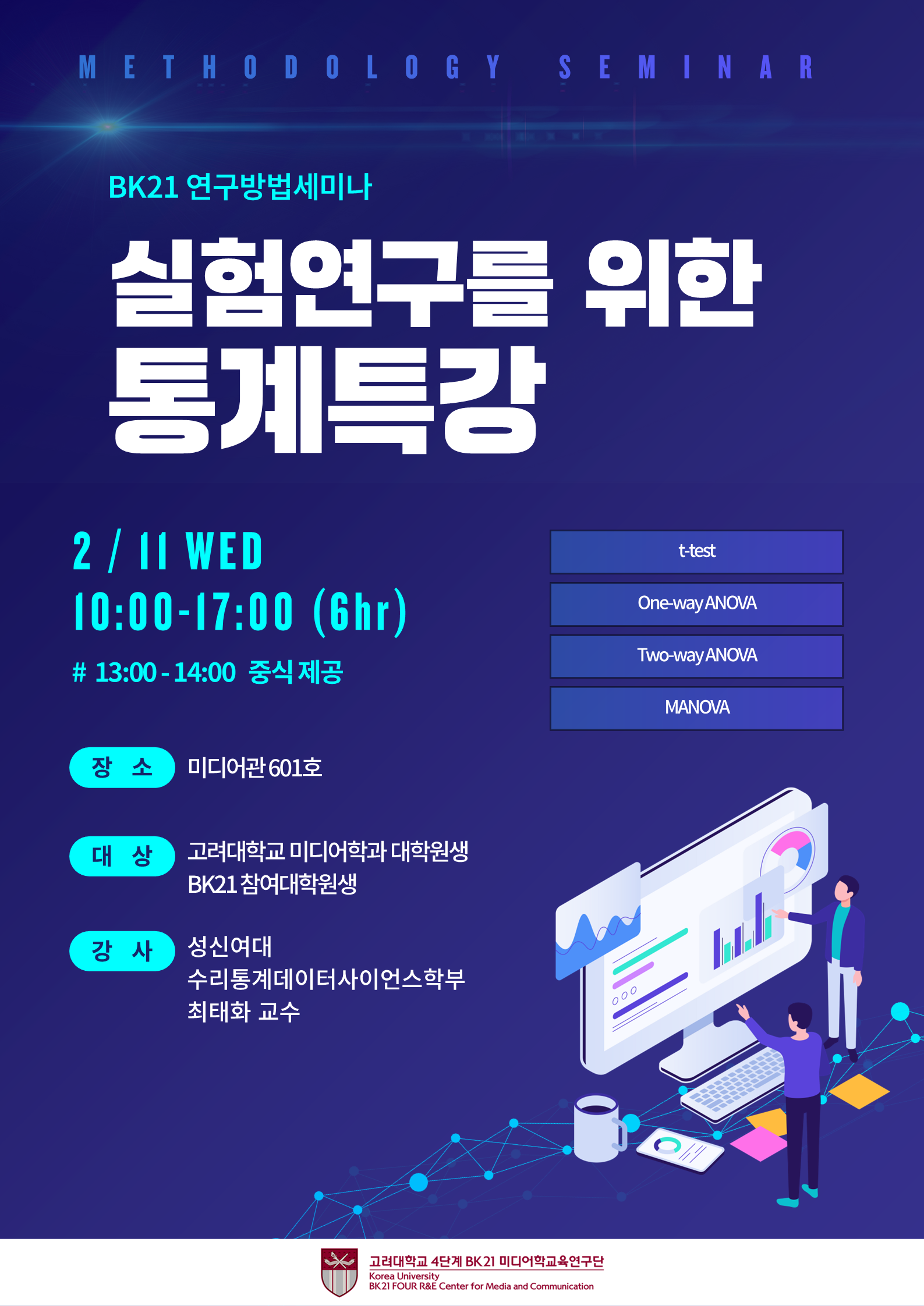 [BK21 연구방법세미나] 실험연구를 위한 통계 특강 1. 일시 : 2026.02.11.(수) 10:00-13:00, 14:00-17:00 2. 장소 : 고려대학교 미디어관 601호 3. 대상 : 4단계 BK21 미디어학교육연구단 참여대학원생, 미디어학과 대학원생, 교수 등 4. 강사 : 최태화(성신여자대학교 수리통계데이터사이언스학부 교수) |