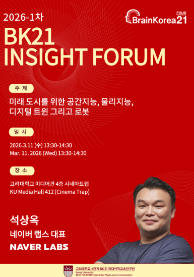 1. 일시 : 2026.03.11.(수) 13:30–14:30 2. 장소 : 고려대 미디어관 412호 3. 대상 : 4단계 BK21 미디어학교육연구단 참여대학원생, 미디어학과 대학원생, 미디어대학 재학생, 교수 등