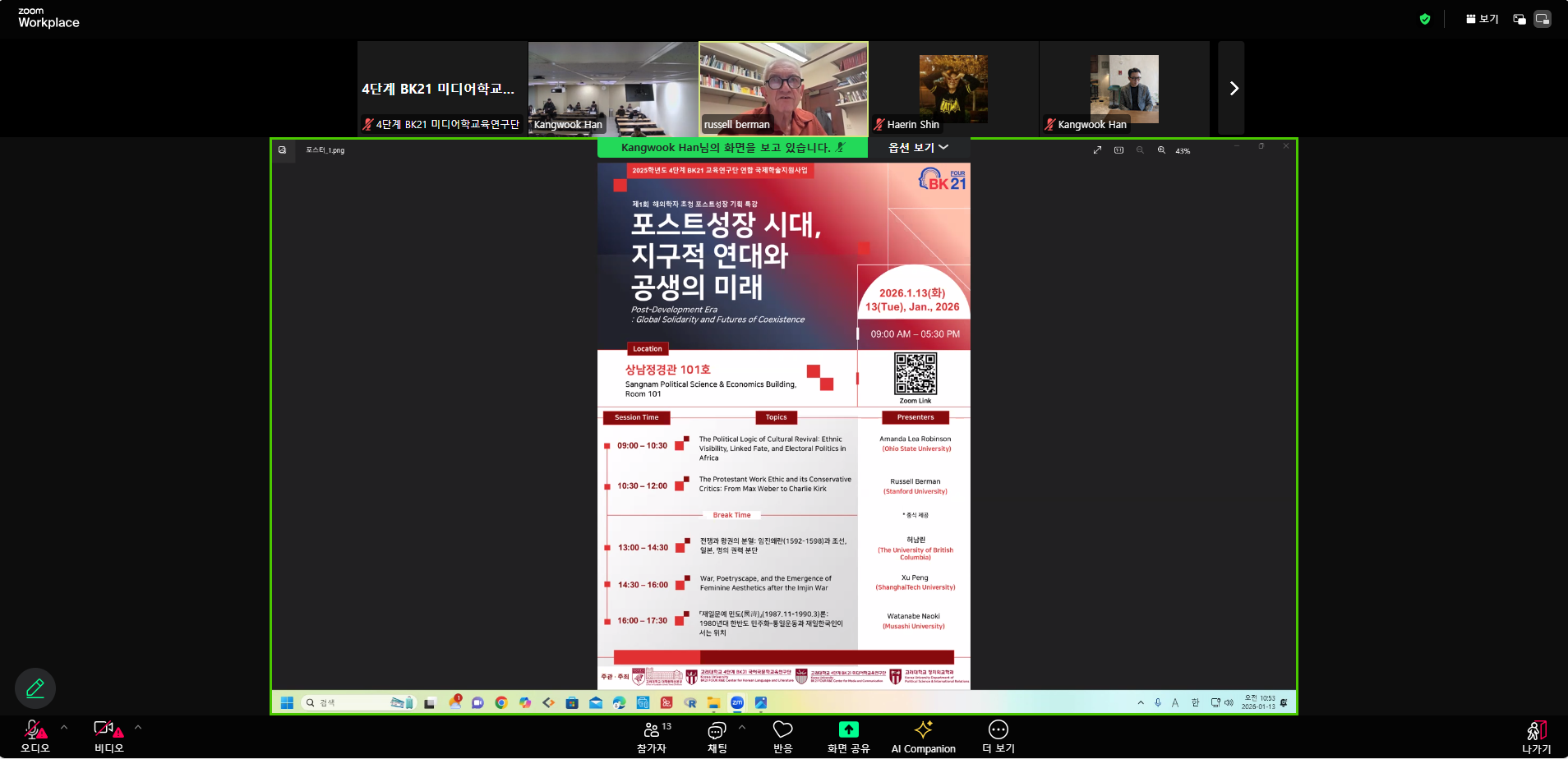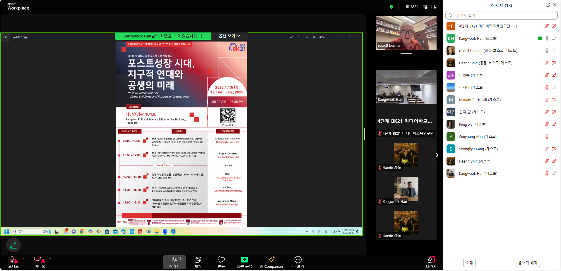 미디어학교육연구단은 2026년 1월 13일(화) 상남정경관 101호에서 제1회 해외학자초청 포스트성장 기획 특강 공동개최하여, Amanda Lea Robinson(Ohio State University), Russell Berman(Stanford University), 허남린(University of British Columbia), Xu Peng(ShanghaiTech University), Watanabe Naoki(Musashi University) 초청하여, 강연 및 토론을 진행하였다. 본 특강에는 고려대 4단계 BK21 미디어학교육연구단 참여대학원생을 포함한 재학생, 교수 등이 참여했다.
