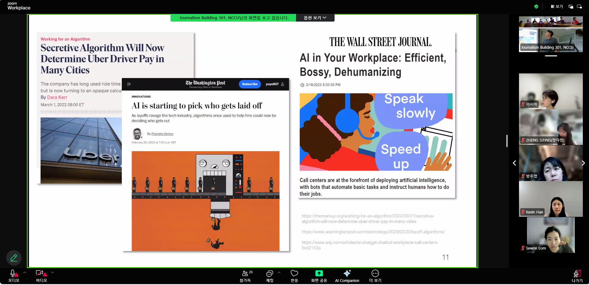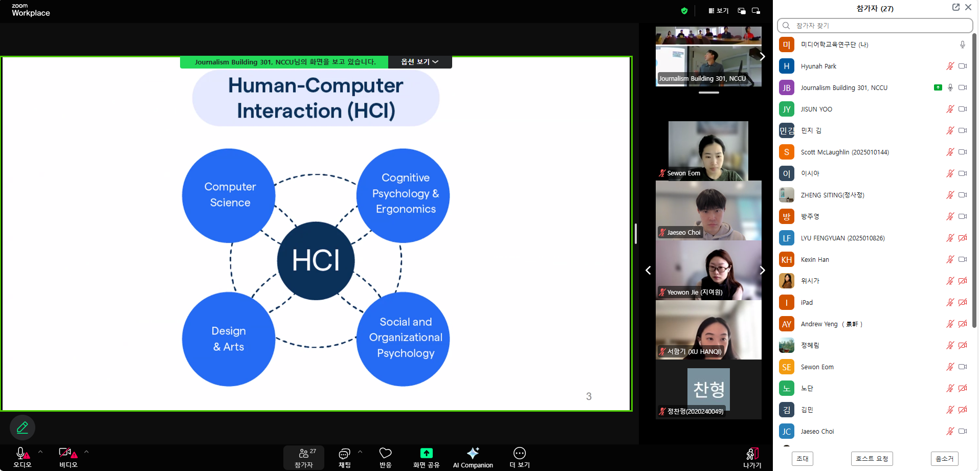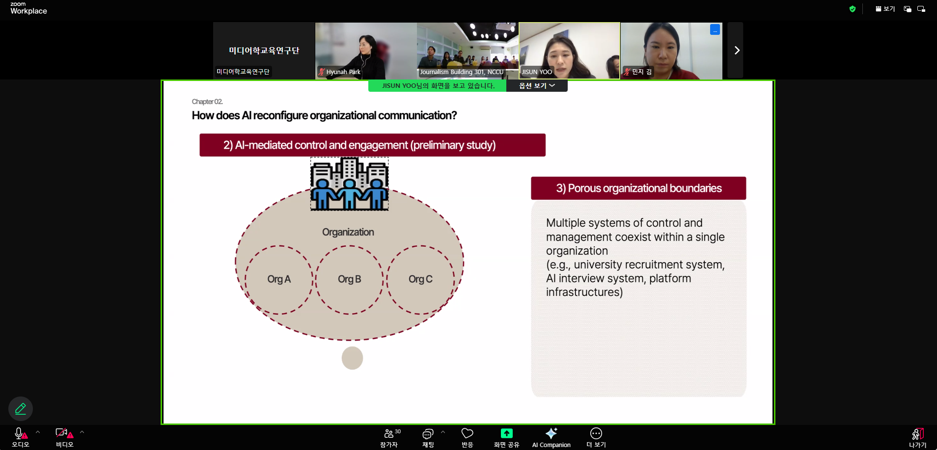 이번 주제는 “AI misinformation: Some predictors and solutions”, “From dyads to networks: AI and the reconfiguration of organizational communication”, “Can Robots Lead Humans? The Social Power in Human-Robot Interaction and Human-AI Interaction”, “Can GenAI Be a Communication Study Researcher? An Experiment on Framing Analysis”로, 발표 후 발표자와 패널들, 학생들간의 토론, 질의, 응답 방식으로 진행했다.