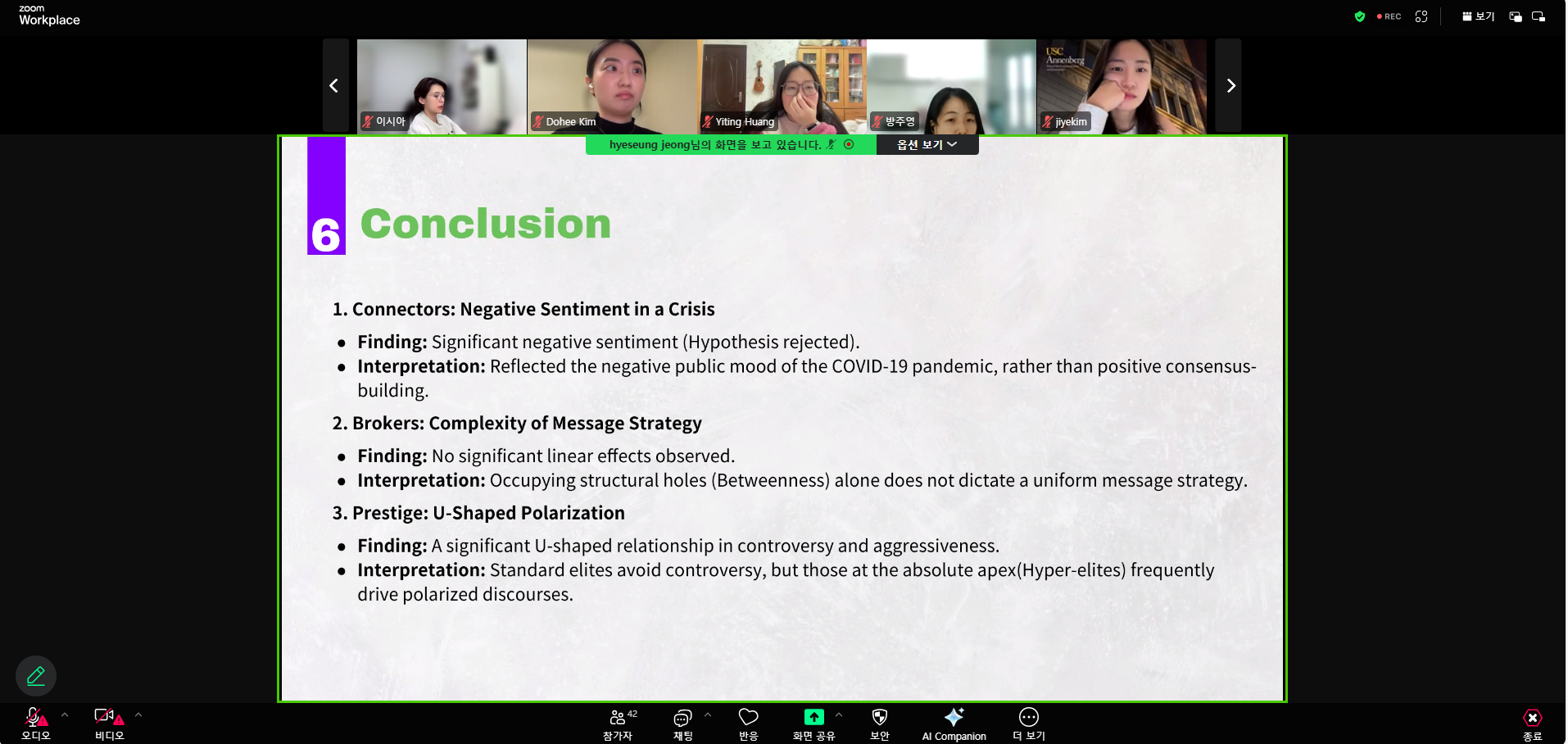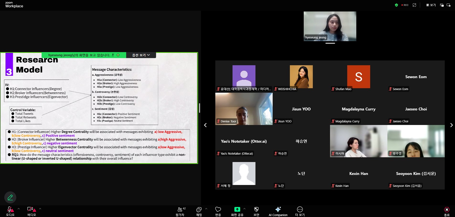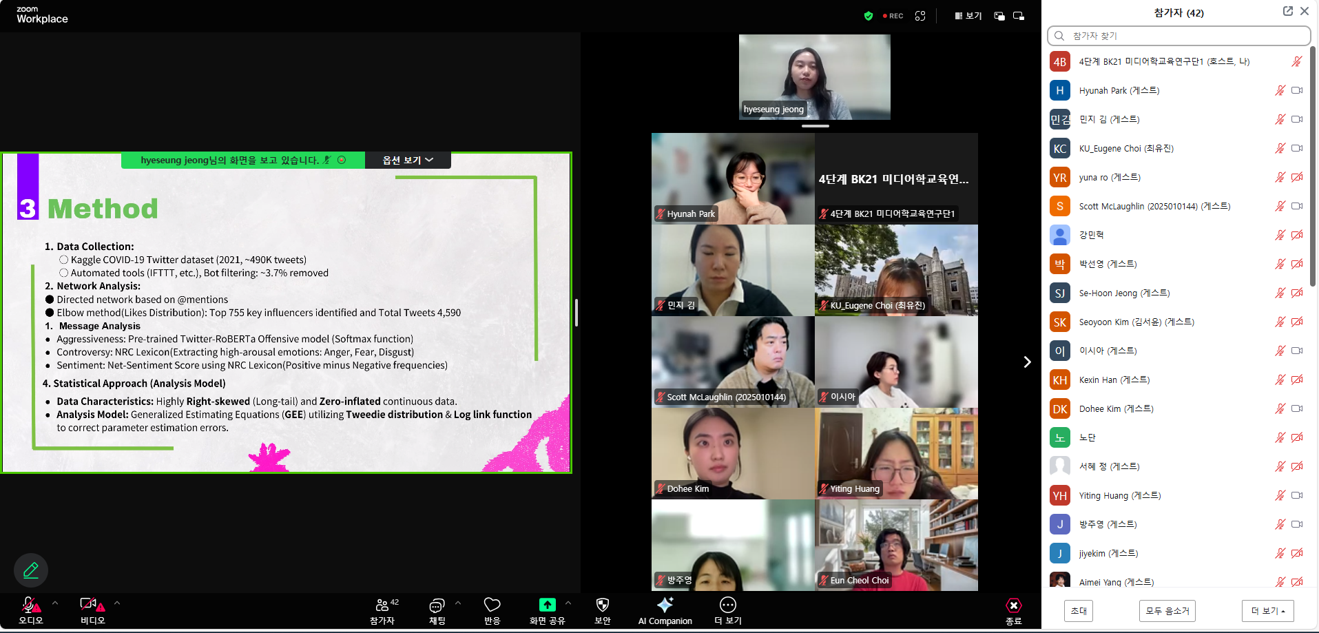 이번 주제는 “Influence Dynamics and Behavioral Outcomes”로, 발표 후 발표자와 교수 학생들간의 토론, 질의, 응답 방식으로 진행했다.