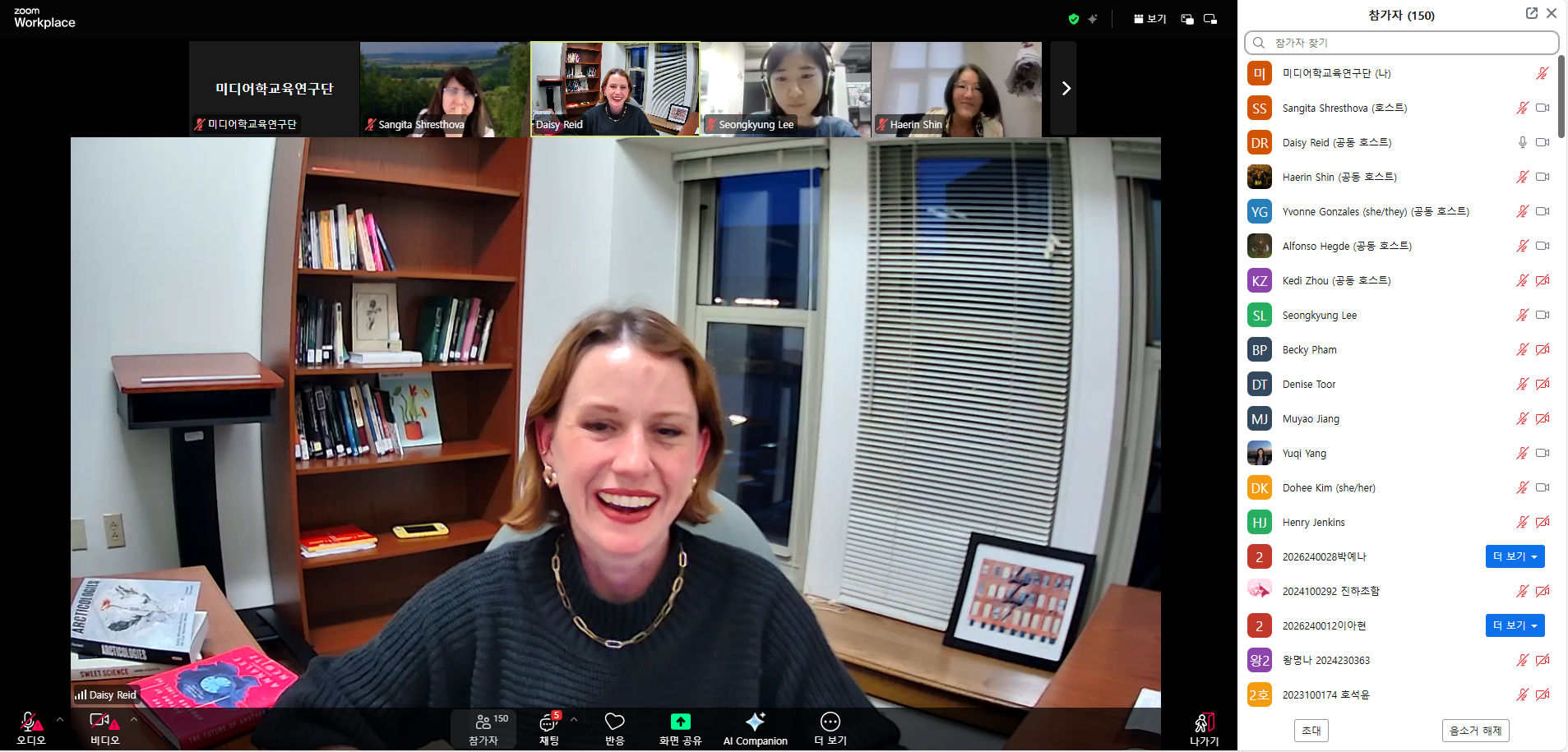 미디어학교육연구단은 2026.04.02.(목) 08:30 온라인줌으로 2026 Global Symposium Series 개최하여, Daisy Reid (Mellon Modeling Interdisciplinary Inquiry Postdoctoral Fellow, Center for the Hummanities Washington University in ST.LOUIS) 강연 및 토론을 진행하였다. 본 심포지엄에는 4단계 BK21 미디어학교육연구단 참여대학원생, 미디어대학원생, 교수 등이 참여했다.